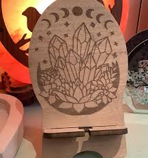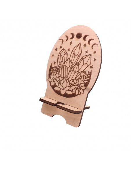This is a wooden phone stand with a creative laser-cut pattern design featuring moon phases and crystal engraving.