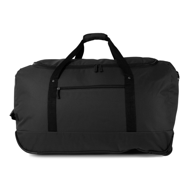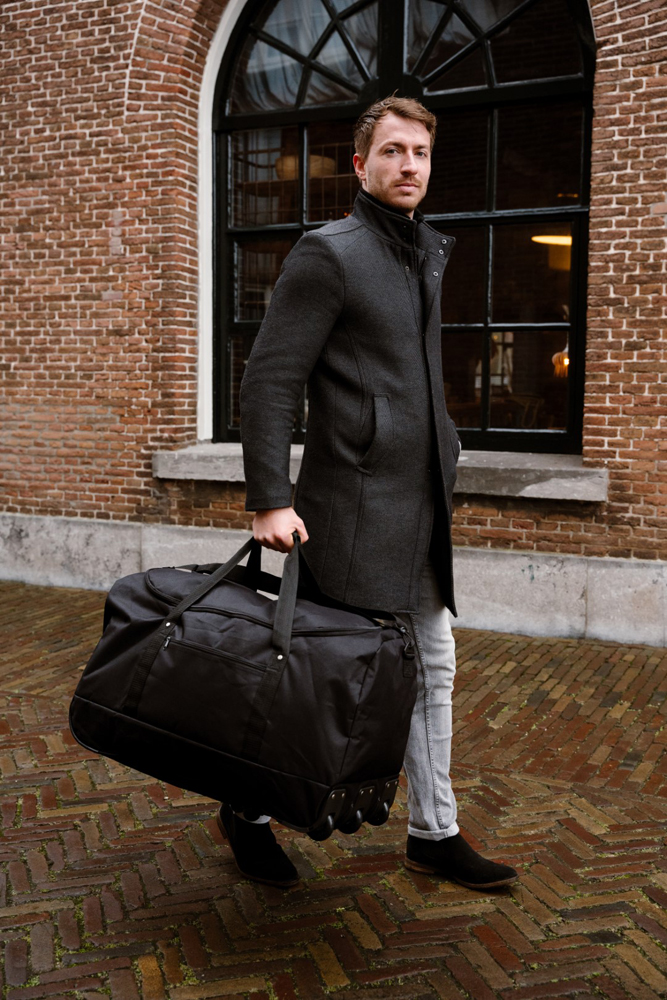 This weekend bag has an adjustable shoulder strap and two extra carrying handles on the top. When you’re not using the bag, you can roll it up completely and store it in the polyester storage bag provided. Another striking feature are the wheels on the bottom. You can easily pull the bag behind you. Finally, you can store small items in the lockable front pocket.