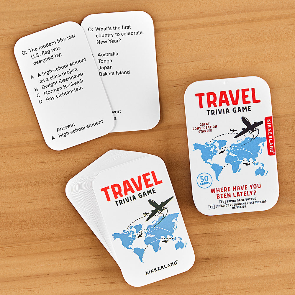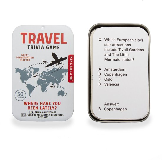 The Trivia Game Travel by Kikkerland contains fifty questions on a single theme: in this case, fifty questions about travelling. The compact tin is easy to take with you, so you can play the quiz on the go or while travelling. The questions are all multiple choice and are written in English. Can you beat your friends?