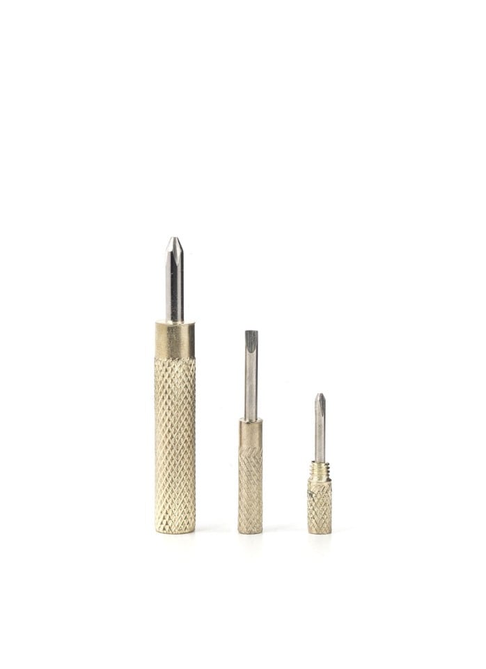 De messing handgreep kan worden losgeschroefd, waarna een mooie schroevendraaier met een stevige grip tevoorschijn komt. Extra schroevendraaierkoppen kunnen worden opgeborgen in de basis van de schroevendraaier.