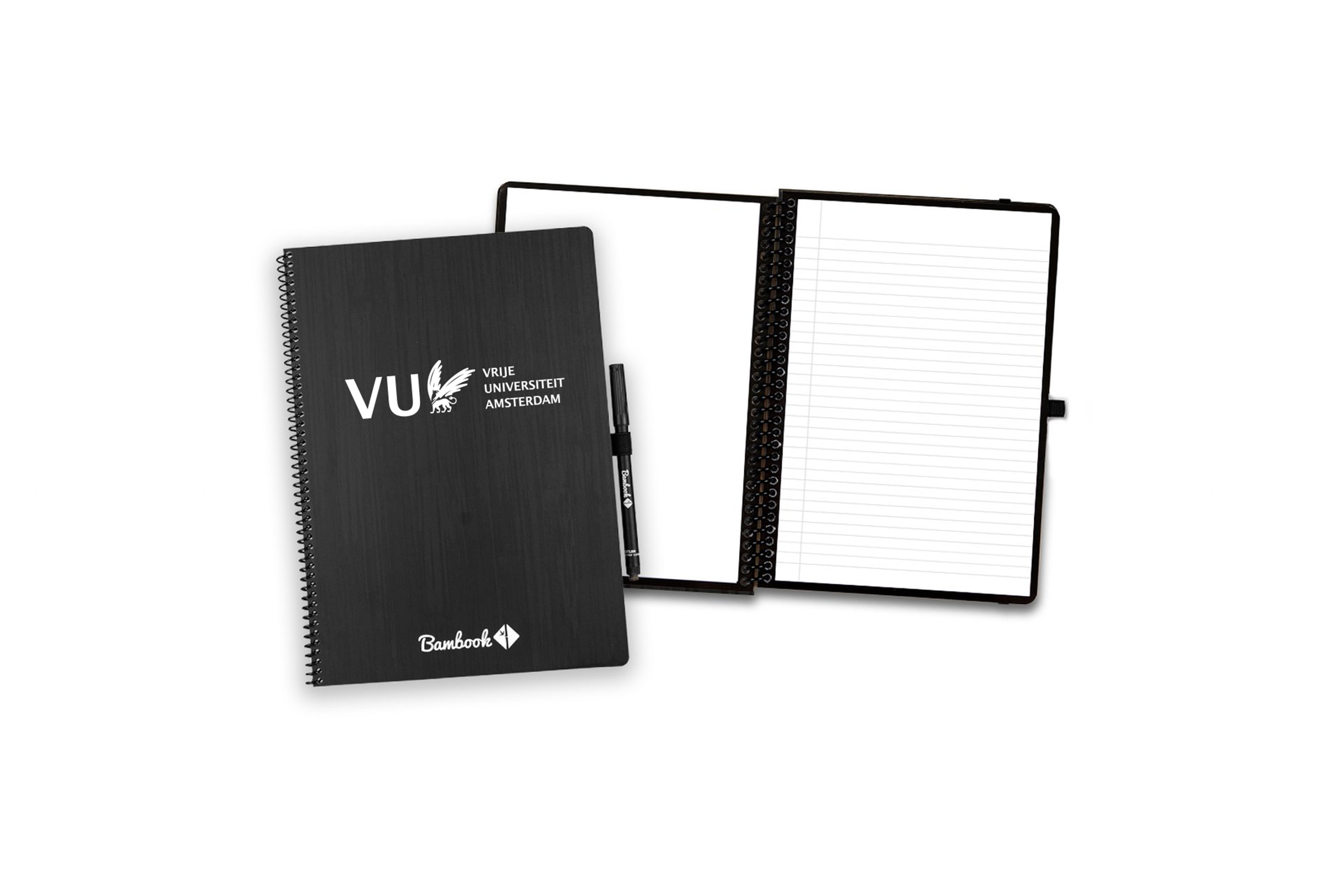 Bambook is het perfecte uitwisbare notitieboek. Schrijf met de speciale marker op de whiteboard pagina’s, scan je aantekeningen met de Bambook App en wis je pagina’s schoon voor hergebruik. Het Bambook notitieboek heeft een softcover FSC-gecertificeerde kaft bedrukt methet beeldmerk van de Vrije Universiteit. Het Bambook Classic Notitieboek bevat 20 uitwisbare bladen, 40 pagina’s in totaal. De linkerpagina is blanco en de rechterpagina is gelinieerd. Met een Bambook notitieboek kies je voor duurzaam schrijven, verminder je papierverspilling en ontbossing en draag je bij aan herbebossing. Inclusief 1 gratis pen.