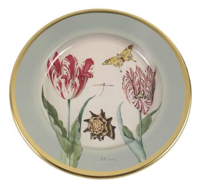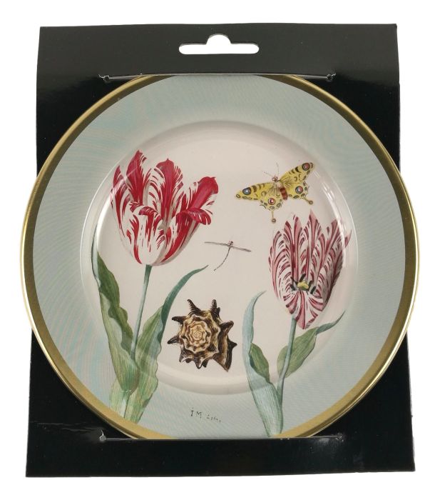 Een klein groen gekleurd metalen sierbordje met een diameter van 16 cm. Het bordje is kleurrijk bedrukt met het werk over twee tulpen met insecten uit de Rijksmuseum collectie van Jacob Marrel. Jacob Marrel was een 17e eeuwse Duitse kunstschilder, werkzaam in Nederland gedurende de Gouden eeuw in onder meer Utrecht. Hij schilderde bloem- en vruchtenstillevens. Omdat dit bordje gemaakt is van metaal is het licht, en makkelijk om mee te nemen.